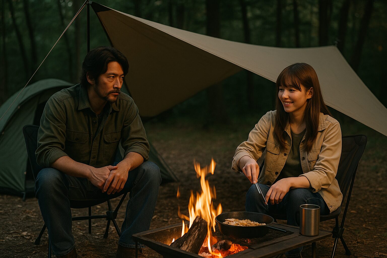 毎回キャンプ場で交わされる食事や焚き火の時間は、ふたりの心を静かにつないでいく大切なシーンです。